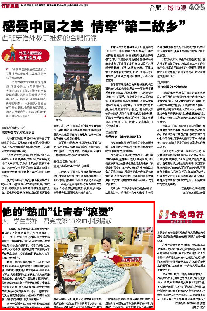 大一学生戴郑一君,在合肥市中心血站完成第10次血小板捐献。记者了解到,这位未满19岁的小伙,在高考后第二天就开始了无偿献血,发自内心的善意让“献血助人”之举实现了最快速度。戴郑一君的父母都是医生,从小的生活环境让他对生命更加珍惜,“小时候常听妈妈说,血液可以挽救许多患者的生命,但血液不可再生,只能来源于大家的捐献。”父母的耳濡目染让长大后的戴郑一君选择了医学院校,同时也坚定地走上了无偿献血之路,“我的血小板指数很好,而且血小板可以更好地帮助患者,所以我坚持捐献血小板。一般捐献后几天内我就