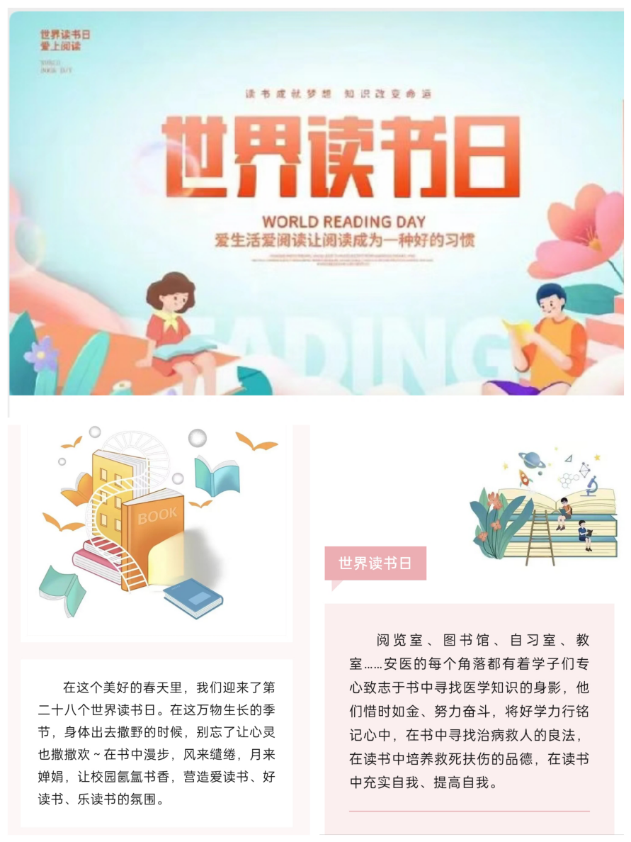 融合视听媒体技术,激发阅读热情。该院将线上线下阅读宣传方式相结合,举办”读白衣红心 阅安医芳华”主题读书创作活动,融合新媒体技术,创新书籍分享途径,通过指导学生开展读书主题征文活动、制作读书朗诵音频和好书分享视频,设计读书分享海报等学生喜闻乐见的形式,充分激发学生阅读兴趣,引导学生快乐阅读,从阅读中汲取奋进力量、坚定理想信念。