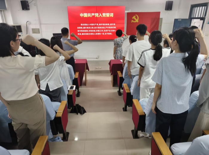 赵梅带领新党员进行了庄严的入党宣誓。全体新党员面对鲜红党旗,高举右拳,铿锵有力的誓词表达了新党员对党的无限忠诚和为党的事业奋斗终身的决心。宣誓后,两位新党员代表发言,表示在今后的学习、工作和生活中,将时刻牢记党员身份,以党员的标准严格要求自己,不断提高思想政治素质和业务能力水平,充分发挥党员先锋模范作用,为党和人民的事业贡献青春和力量。